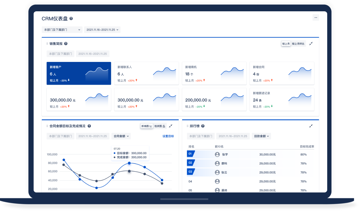 豐富的報表類型關聯了多樣的數據主體:客戶、線索、商機、合同、地域分布、跟進次數等等可實時查看,全面把握客戶動態,激發員工能動性。